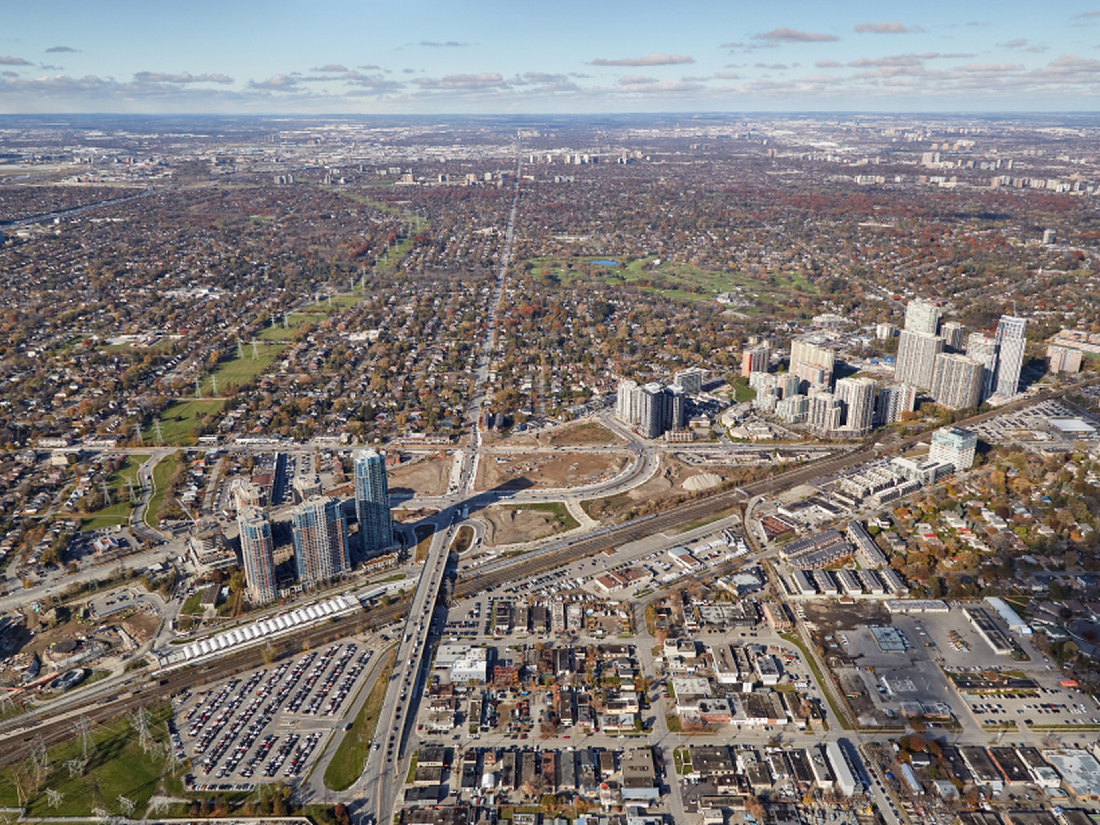 - High-density residential (to the west and north), low-density residential (further north), low-density industrial buildings, the subway and rail corridor (to the south) and retail and commercial plazas (to the north and west).