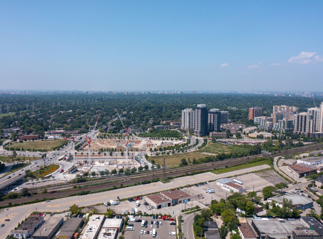 - High-density residential (to the west and north), low-density residential (further north), low-density industrial buildings, the subway and rail corridor (to the south) and retail and commercial plazas to the north.